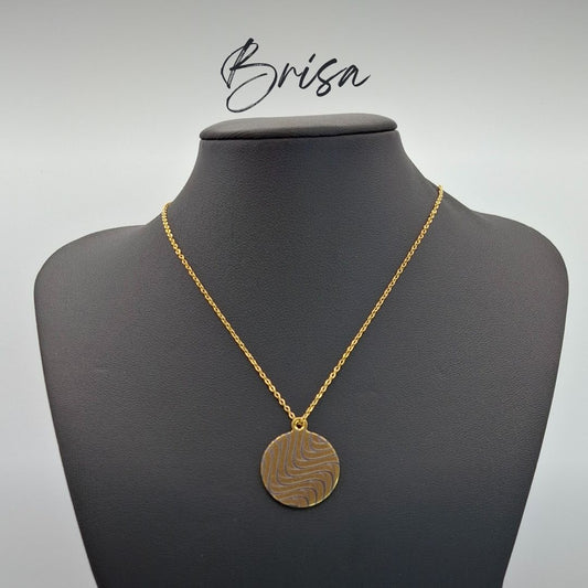 Pendentes redondos, gravados a laser, em aço dourado com fio
