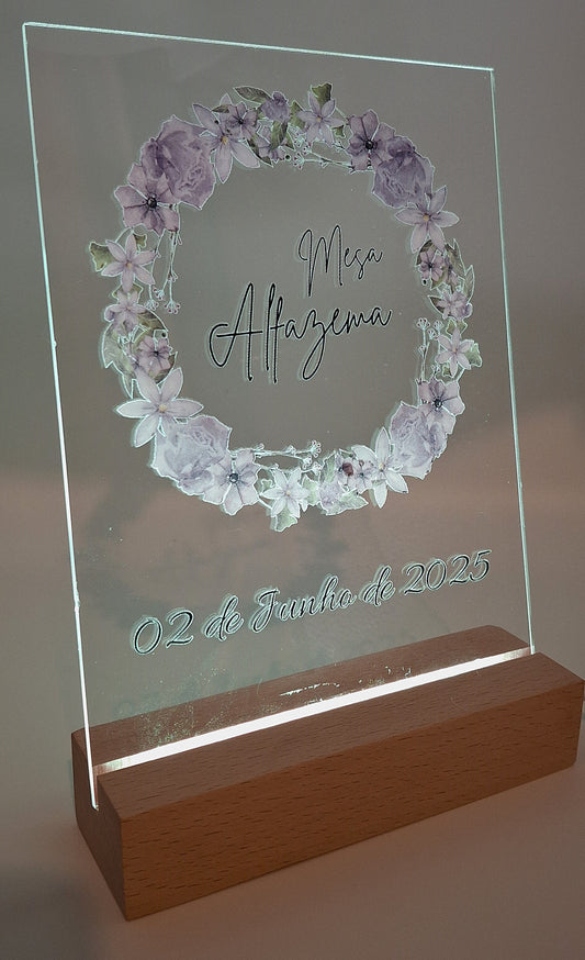 Paineis A5 comemorativos ou informativos em acrilico, com base madeira e iluminação LED