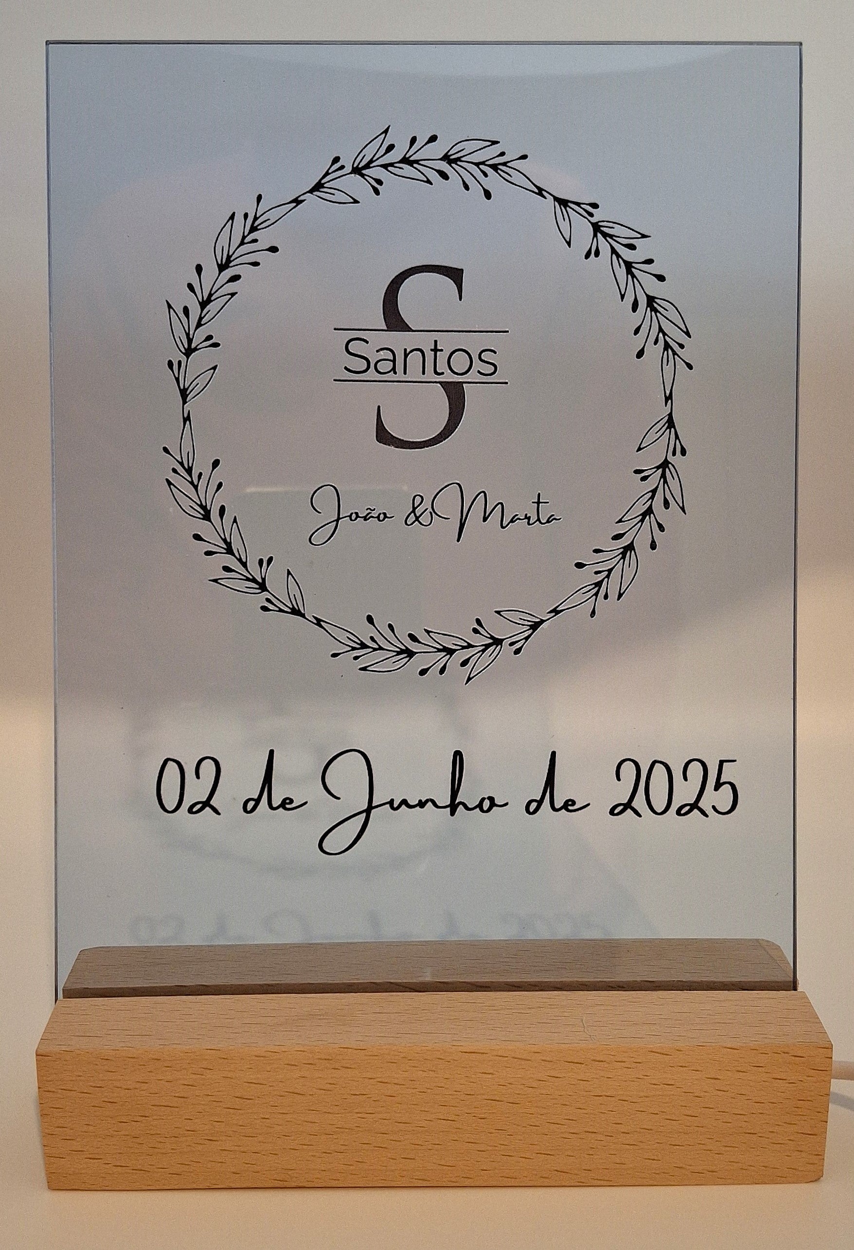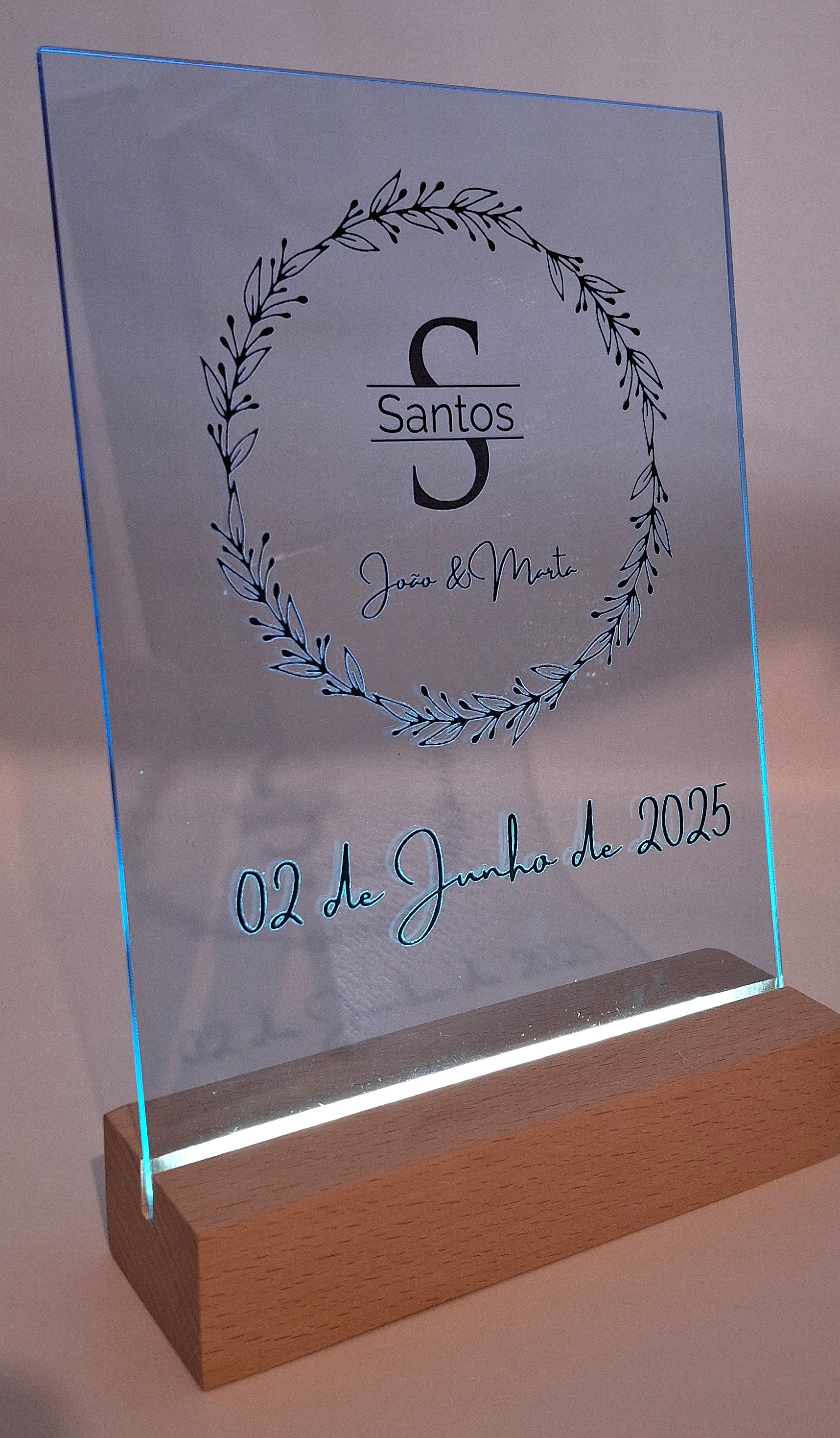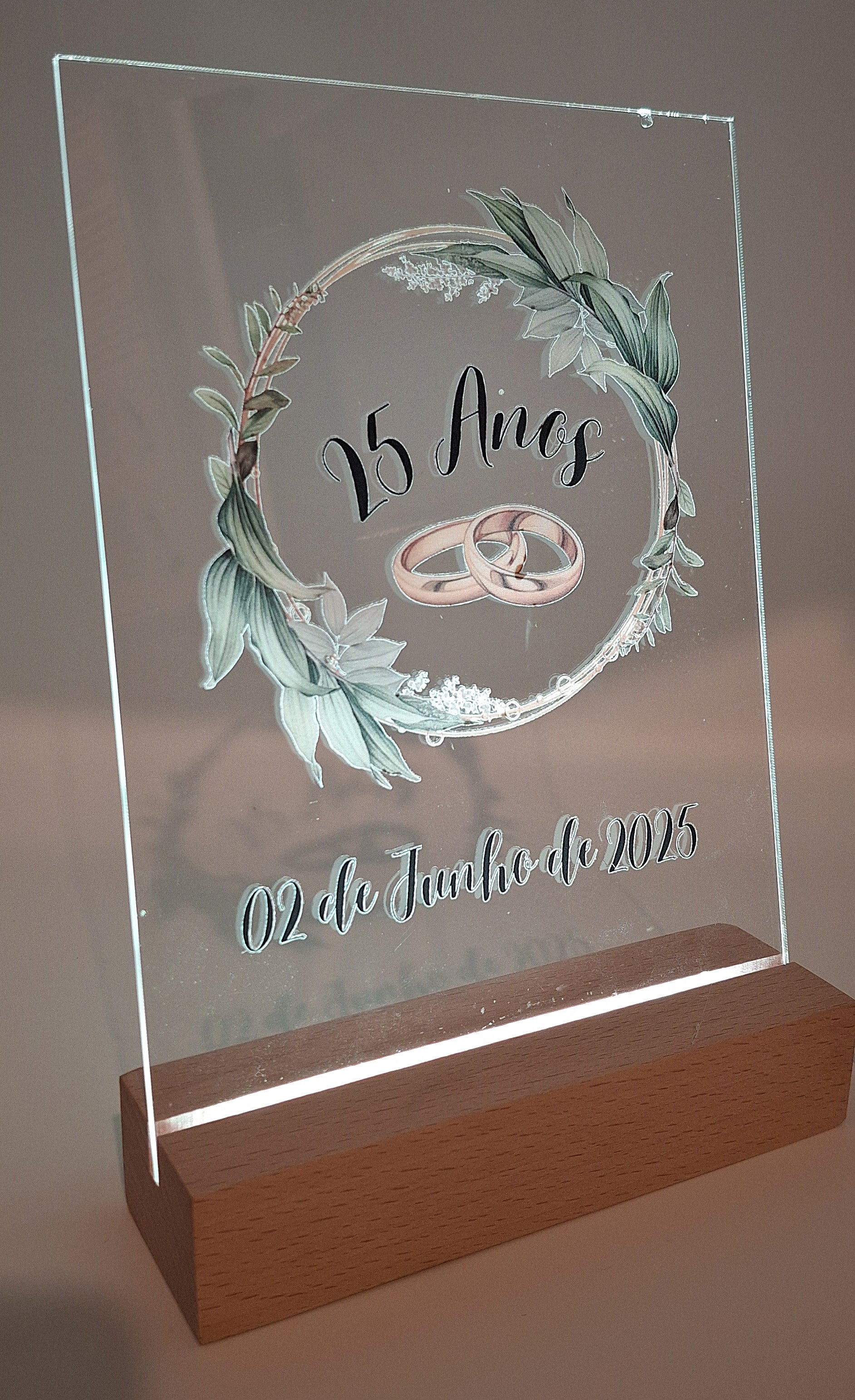 Paineis A5 comemorativos ou informativos em acrilico, com base madeira e iluminação LED