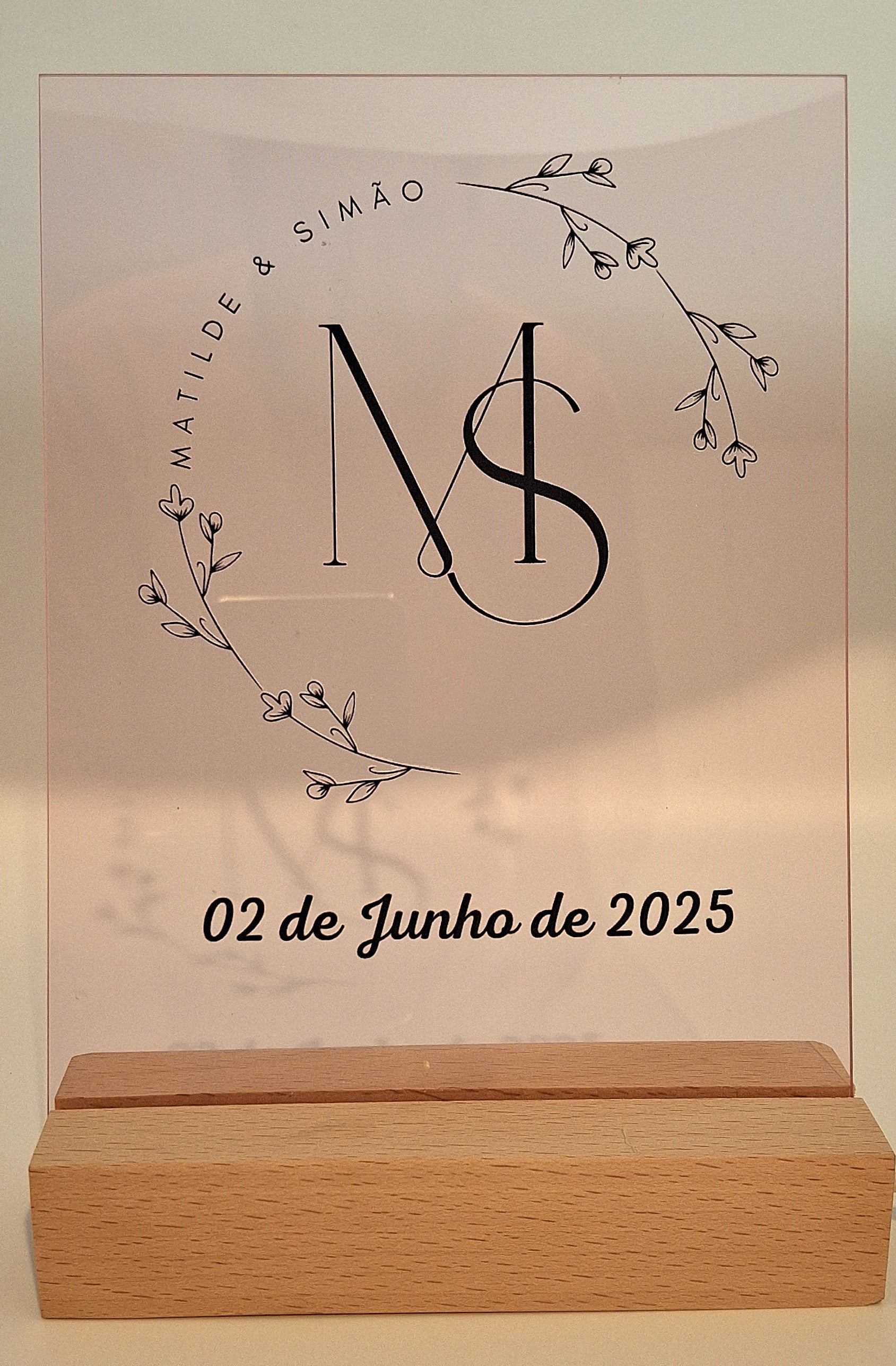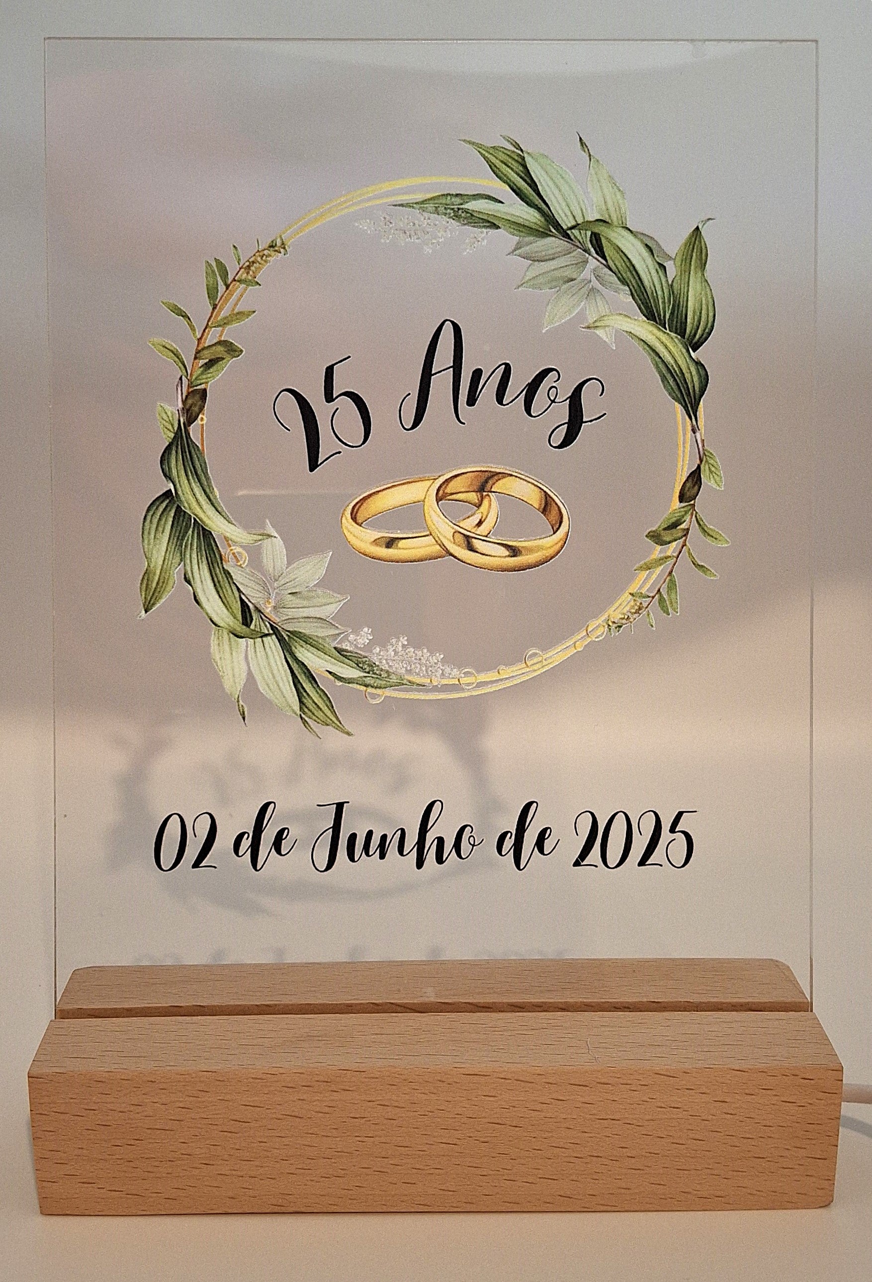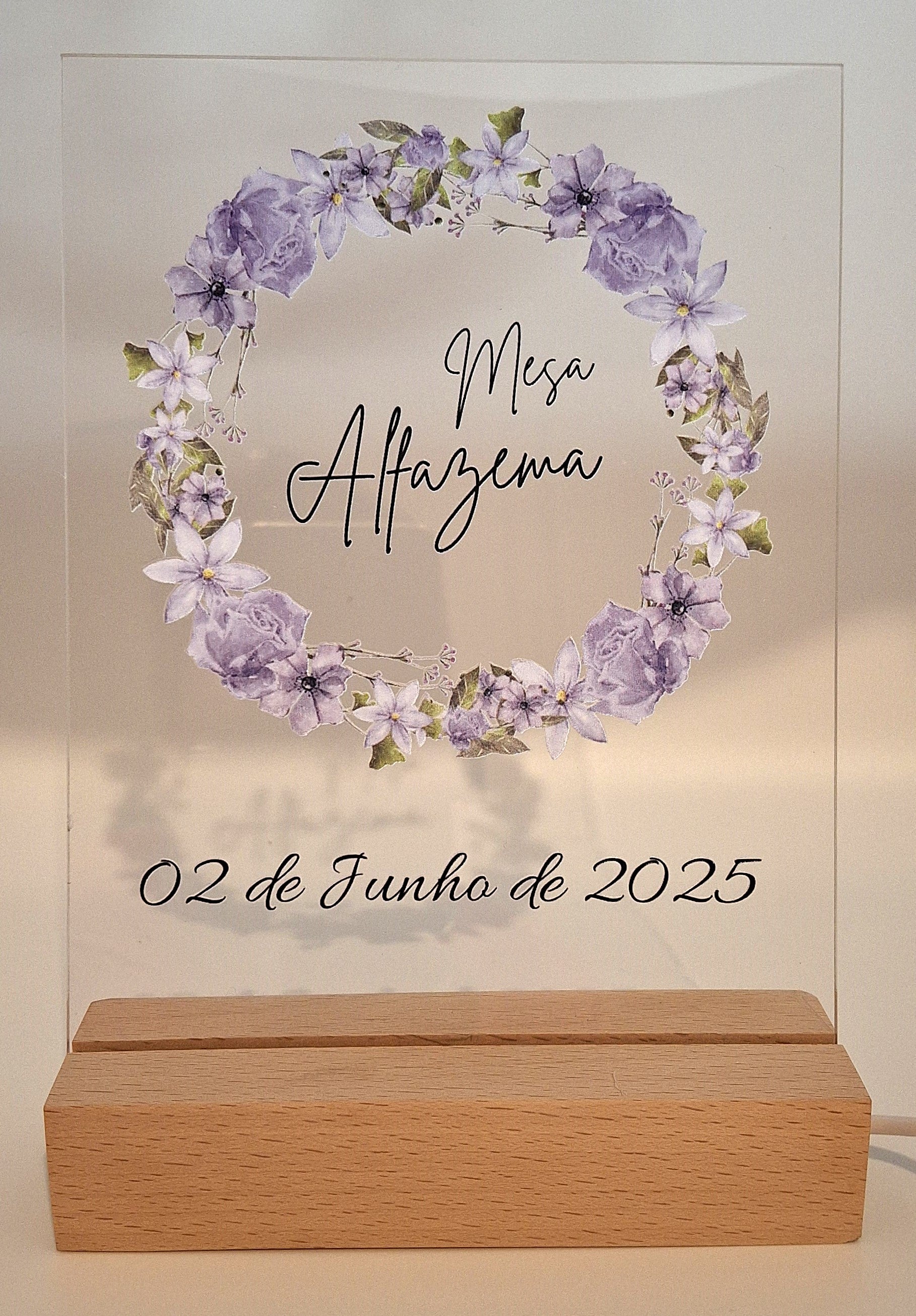 Paineis A5 comemorativos ou informativos em acrilico, com base madeira e iluminação LED
